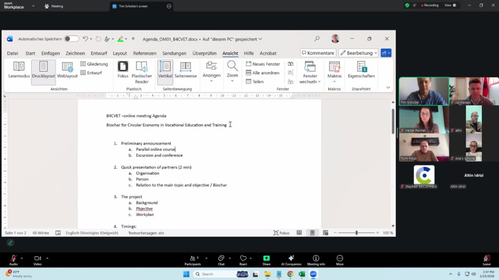 Sot, Shkolla Profesionale Elbasan mori pjesë në takimin e parë online pre–kick-off të projektit B4CVET – Biochar for Circular Economy in Vocational Education and Training. Ky takim shënoi nisjen zyrtare të bashkëpunimit mes partnerëve, përpara aktivitetit të parë fizik që do të zhvillohet në muajin prill në Nienburg (Hanover), Gjermani, në kuadër të konferencës ndërkombëtare “From Cultivation to Construction – Contributing to the Circular Carbon Economy.”